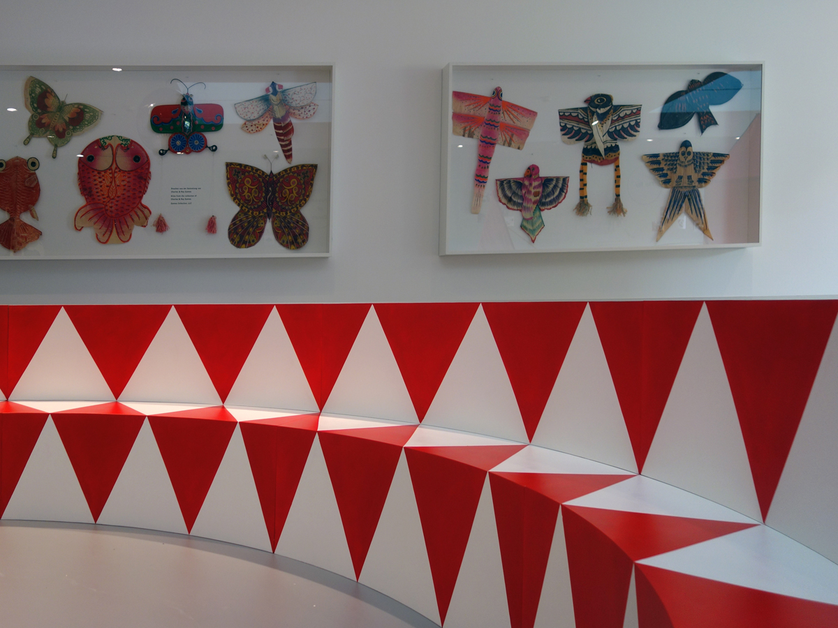»Play Parade« is a hybrid world of fantasy and museum: the installation shows how the Eameses gave expression to their endless supply of ideas by designing, collecting and displaying all kinds of objects. Colourfully patterned paper kites and graphically striking masks from the Eameses’ toy collection serve as a backdrop for their own toy designs from the 1950s. Original artefacts can be viewed in showcases, while visitors are invited to touch and play with replicas and re-editions. Early Eames films such as »Tops« or »Parade«, featuring a choreography of spinning tops or a series of dolls and toy vehicles parading in front of painted scenery, set the exhibited objects in motion.